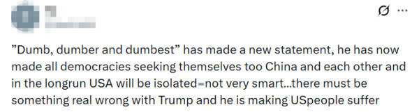 还有美国网友哀叹道,“‘无脑、更无脑、最无脑’的家伙又出惊人言论了。他正让所有国家纷纷转向中国、彼此抱团,长远来看美国只会陷入孤立,这实在太不明智了……特朗普的脑子肯定出了大问题,而他的所作所为,正让美国民众跟着遭殃。”