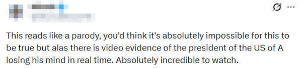 “这事儿听着跟恶搞段子似的,甚至像假的,可偏偏有视频证据,记录下这位美国总统当场失心疯的全过程。这画面,实在太离谱了。”