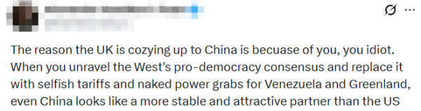 有人大骂道,“英国如今主动靠拢中国,根源全在你身上,你这个蠢货。正是你瓦解了西方共识,转而推行自私自利的关税政策,还明目张胆地争夺委内瑞拉和格陵兰的利益。中国现在可比美国是更稳定、更具吸引力的合作伙伴。”