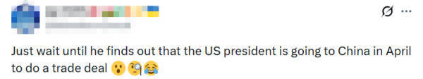 而特朗普的这番“神级变脸”表演,也引来社交平台X上的网友纷纷嘲讽,“这是真疯了。”