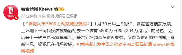 1月30日早上9时许,香港警方接获报案,上环地下一间找换店被劫匪劫去一个装有5800万日元(294万港元)的背包,之后登上一辆白色私家车离开。警方到场调查在附近兜截,又翻查附近监控画面。最新消息,疑犯已在机场被捕。