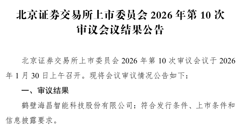 【大河财立方 记者 夏晨翔】1月30日,北交所上市委员会所发布2026年第10次审议会议结果,鹤壁海昌智能科技股份有限公司(以下简称海昌智能)成功过会,距离登陆资本市场更进一步。