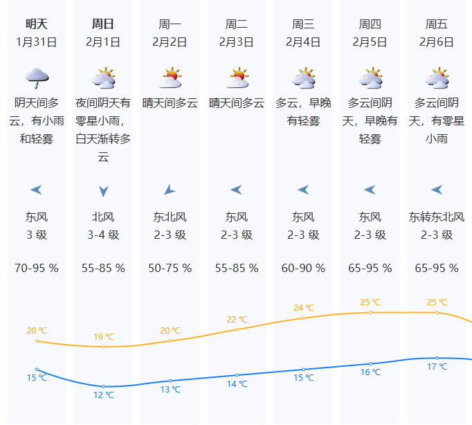 31日夜间至2月1日受新一股冷空气影响,白天渐转多云,风力加大,气温下降;2月1日早晨 最低气温将降至12℃左右,体感较冷,注意及时加衣保暖。