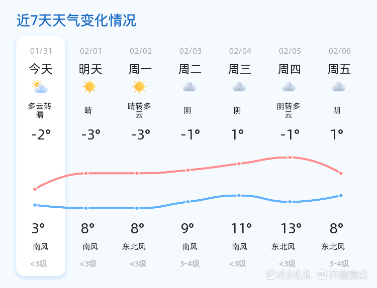 今天是2026年1月31日,农历十二月十三,星期六。泰安市今天天气多云转晴,气温在-2℃到3℃之间,西南风2级,空气湿度83%。全市各区天气情况基本一致,均为多云转晴,温度适宜,市民出行较为舒适。 PM2.5浓度为150,空气质量处于中等水平。预计今天白天最高气温可达3℃,最低气温为-2注意保暖。 明天,泰安市将迎来晴朗天气,气温将进一步回升,最高气温可达8℃,最低气温为-3℃,较今天有所上升。风力依旧较小,南风2级左右,天气条件较为适宜户外活动。与今天相比,明天天气更加晴朗,气温回升明显,市民出行体验将更加舒适。 未来三天,泰安市天气将呈现晴转多云的趋势。预计2月2日,天气晴转多云,气温在-3℃到8℃之间;2月3日,天气阴,气温略有回升,最高气温可达9℃,最低气温为-1℃,风力有所增强,东北风3-4级。市民需根据天气变化及时增减衣物,注意防范风力较大的时段对出行的影响。 提示市民朋友,近期气温较低,出行时请做好保暖措施,尤其注意头部、手部和脚部的防寒。同时,空气质量指数处于中等水平,敏感人群建议减少户外活动时间。未来几天天气变化较为明显,请市民及时关注天气预报,合理安排出行计划,确保安全。
