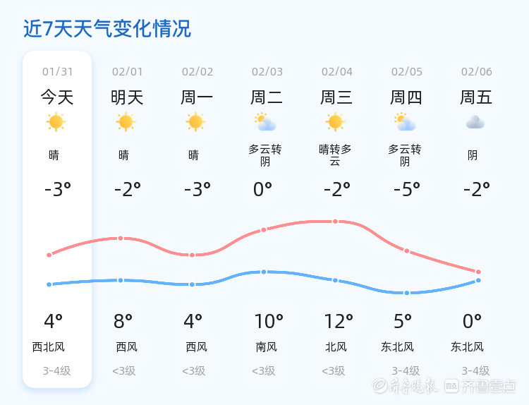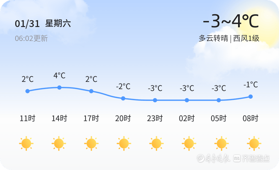 今天是2026年1月31日,星期六,农历十二月十三。东营市今天天气多云转晴,气温在-3℃到4℃之间,西风1级,空气湿度64%,PM2.5指数89。各区天气情况基本一致,以晴朗为主,市民出行较为适宜。明天是2月1日,星期日,天气晴朗,气温较今日有所回升,最高气温可达8℃,最低气温-2℃,风力不大,西风小于3级。市民可适当减少衣物,享受温暖的阳光。未来三天,东营市天气以晴到多云为主,气温波动不大,最高气温8℃,最低气温-3℃。市民需根据天气变化及时增减衣物,特别是早晚温差较大,容易感冒。温馨提示