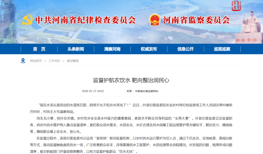民生无小事,枝叶总关情。农村饮水安全是乡村振兴的重要基础,更是关乎群众切身利益的“头等大事”。叶县纪委监委立足监督职责,将农村供水管护纳入重点监督清单,紧盯群众用水需求、水质安全、水价合理及供水保障工程运维管护等关键环节,靶向发力、精准施策,确保群众喝上安全水、放心水。