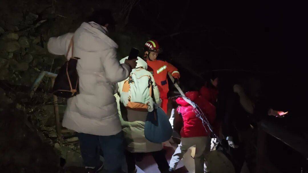 1月27日晚,在北京平谷区一处封闭景区,一个45人的游学团因天色变暗滞留山中。消防员克服夜间山路崎岖、视线不佳等不利条件,成功找到全部被困人员,并安全护送他们下山。
