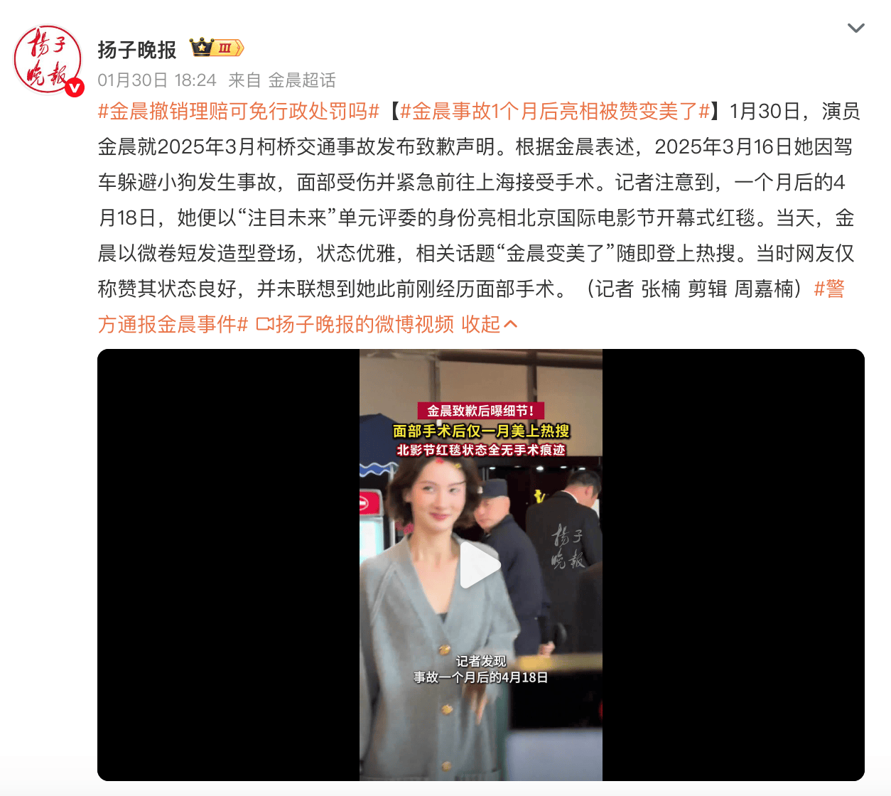 1月30日,演员金晨就2025年3月柯桥交通事故发布致歉声明。根据金晨表述,2025年3月16日她因驾车躲避小狗发生事故,面部受伤并紧急前往上海接受手术。记者注意到,一个月后的4月18日,她便以“注目未来”单元评委的身份亮相北京国际电影节开幕式红毯。当天,金晨以微卷短发造型登场,状态优雅,相关话题“金晨变美了”随即登上热搜。当时网友仅称赞其状态良好,并未联想到她此前刚经历面部手术。