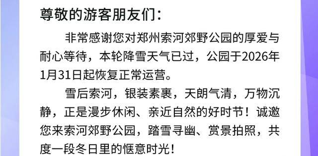 1月31日,记者从老君山、郑州索河郊野公园、龙潭大峡谷等景区了解到,当前天气情况转好,景区道路恢复畅通,已达到开园条件。周末有出游计划的朋友请及时关注各景区发布的相关信息。部分景区开园公告如下: