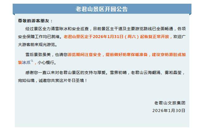 经全面除雪除冰及安全排查,该景区已于昨日(1月30日)正式恢复开放。