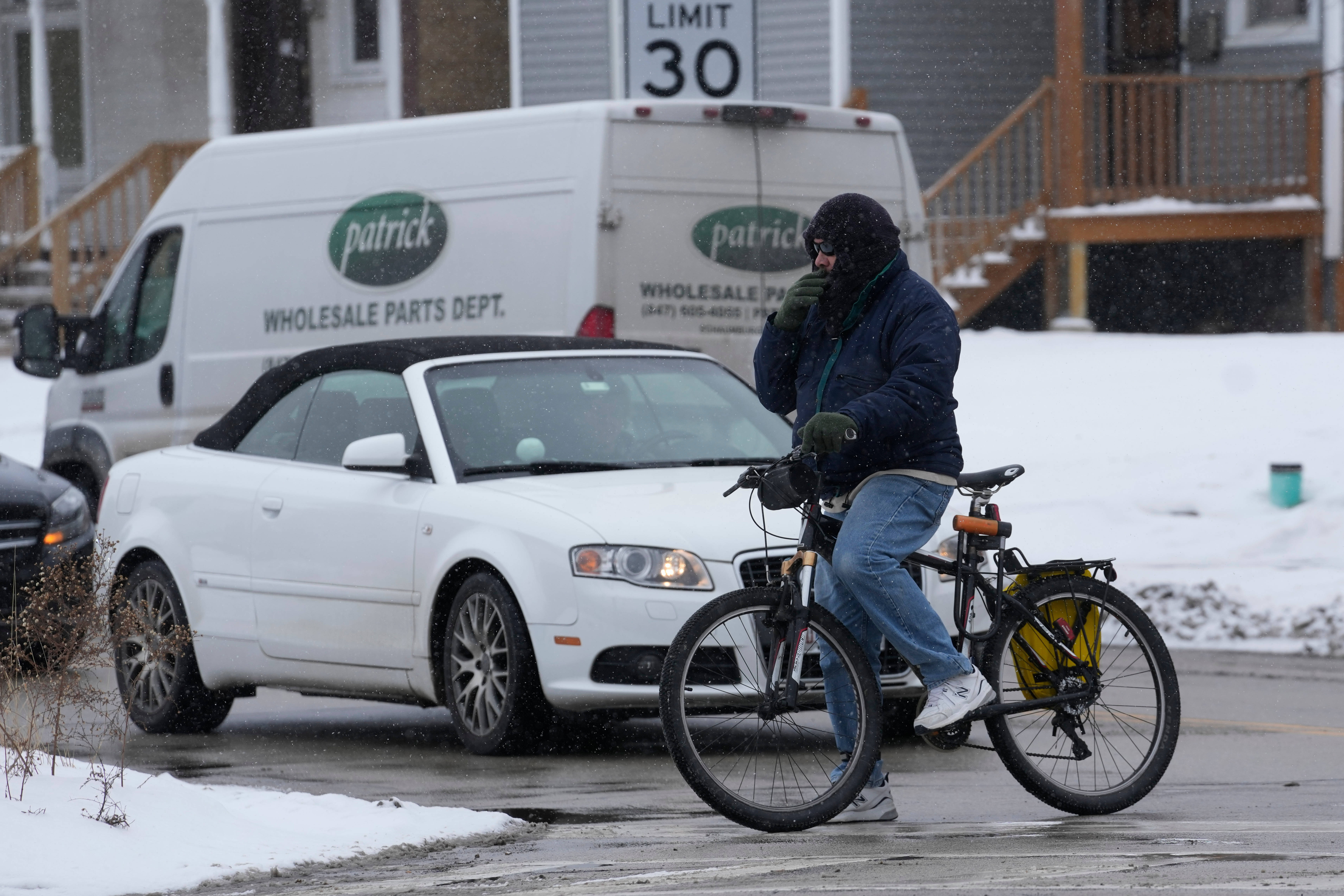 1月30日,在美国埃文斯顿,一名骑自行车的人冒雪出行。 新华社/美联