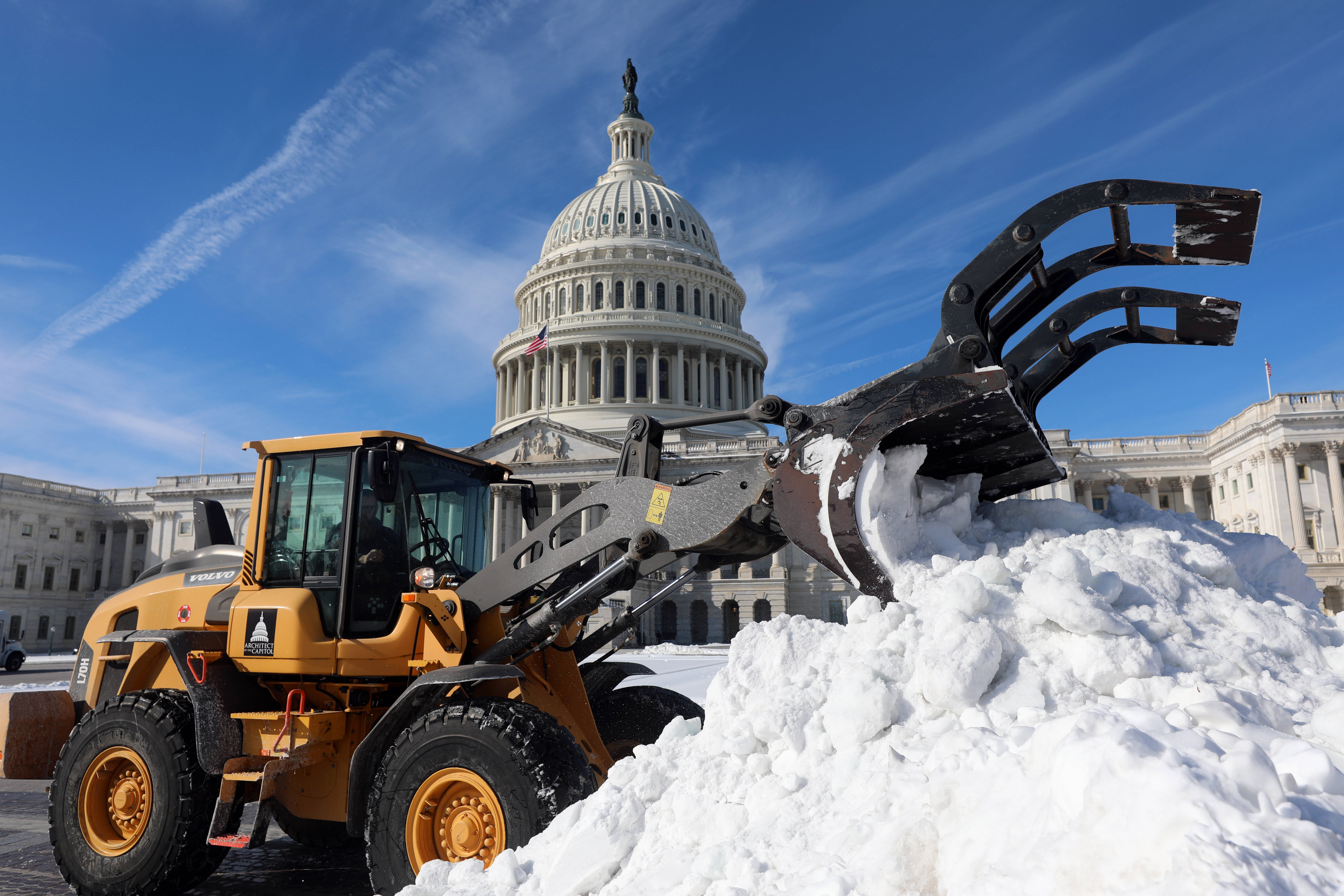 1月30日,在美国华盛顿,工人在国会大厦前操纵机械车辆清扫积雪。 新华社/美联