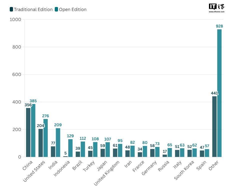 从上榜大学数量来看,不管是传统版还是开放版,中国大学依然排名第一,分别达到了 356 所和 385 所,美国上榜大学数量排名第二,印度第三。