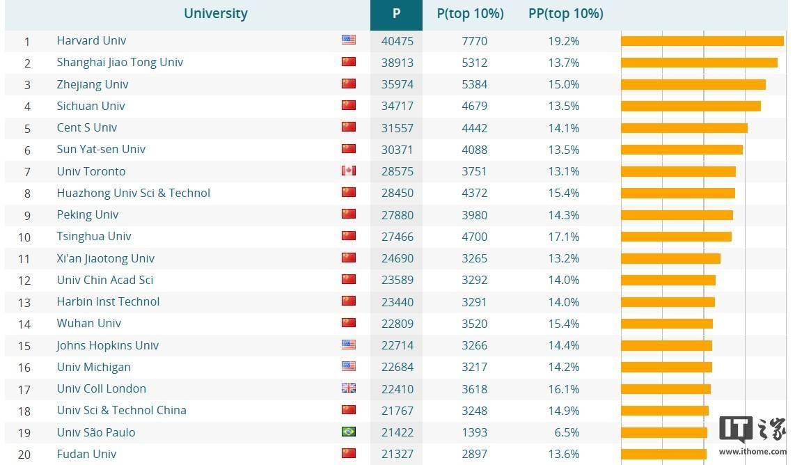 可以看到,浙江大学凭借 40492 篇核心出版物论文遥遥领先于其他大学;不过 P(top 10%)数据中美国哈佛大学依然一骑绝尘,达到 7003 篇,因此还是要正视差距,继续加油。