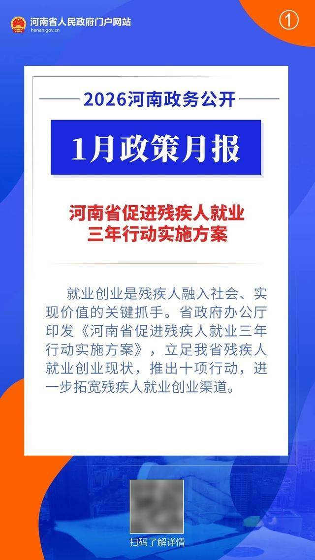 2026年1月,河南省人民政府出台多项重要政策,包括河南省促进残疾人就业三年行动实施方案、河南省深化养老服务改革发展三年行动计划、河南省粮食节约和反食品浪费实施方案、河南省国有企业境外债券管理办法、推动2026年第一季度经济发展实现良好开局若干政策措施、河南省提升中药质量促进中医药产业高质量发展若干政策措施、河南省自然灾害调查评估暂行办法。通过河南政务公开1月政策月报,一起来看详情——