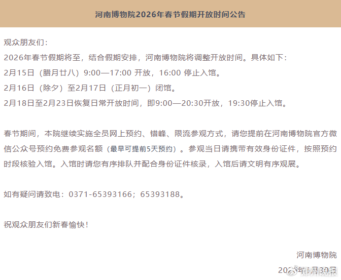 1月30日,河南博物院发布2026年春节假期开放公告。2月15日(腊月廿八)9:00-17:00 开放,16:00 停止入馆。2月16日(除夕)至2月17日(正月初一)闭馆。2月18日至23日恢复日常开放时间。