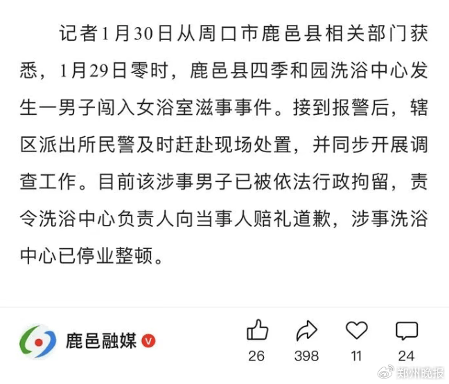 周口一男子强闯女澡堂滋事,当地通报
