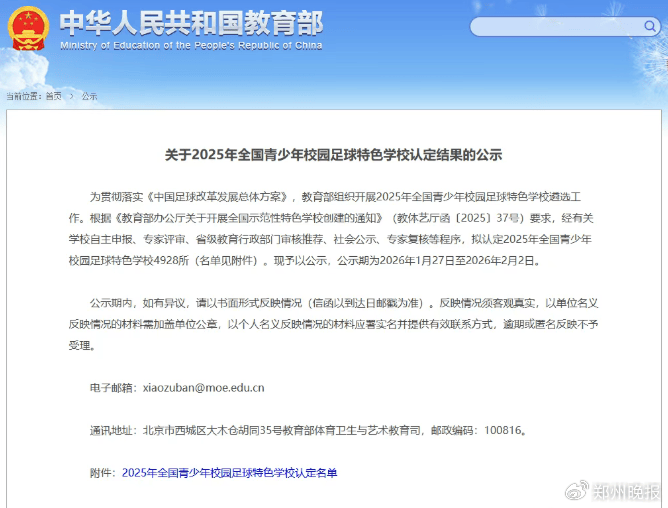 近日,教育部办公厅发布关于2025年度全国青少年校园足球特色学校认定结果的公示,拟认定全国青少年校园足球特色学校4928所,其中,河南435所学校入围公示名单。