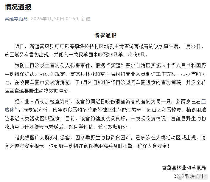 1月30日,新疆富蕴通报:又有雪豹出现咬死35只羊,初判同咬伤滑雪游客的为同一只,系两岁左右亚成体,已捕获并转运至救助中心,待科学评估后适时放归野外。