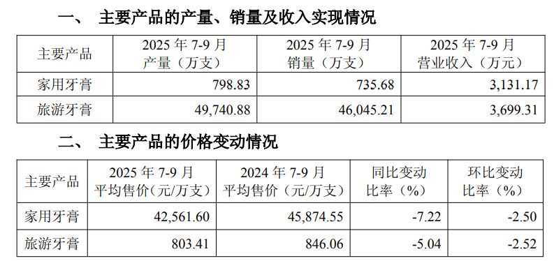 从两面针披露的2025年第三季度主要经营数据来看,其两大主要产品的营收和价格同比变动也有所下滑。两面针2025年第三季度的家用牙膏的营收为3131.17万元,同比下滑18.45%,平均售价同比减少7.22%;旅游牙膏的营收为3699.31万元,同比增长6.13%,平均售价同比减少5.04%。