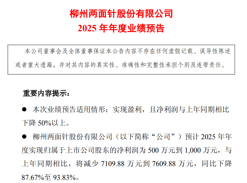 近日,两面针发布2025年业绩预告称,其预计2025年年度实现归属于上市公司股东的净利润为500万元到1000 万元,与上年同期相比,将减少7109.88万元到7609.88万元,同比下降87.67%至93.83%。