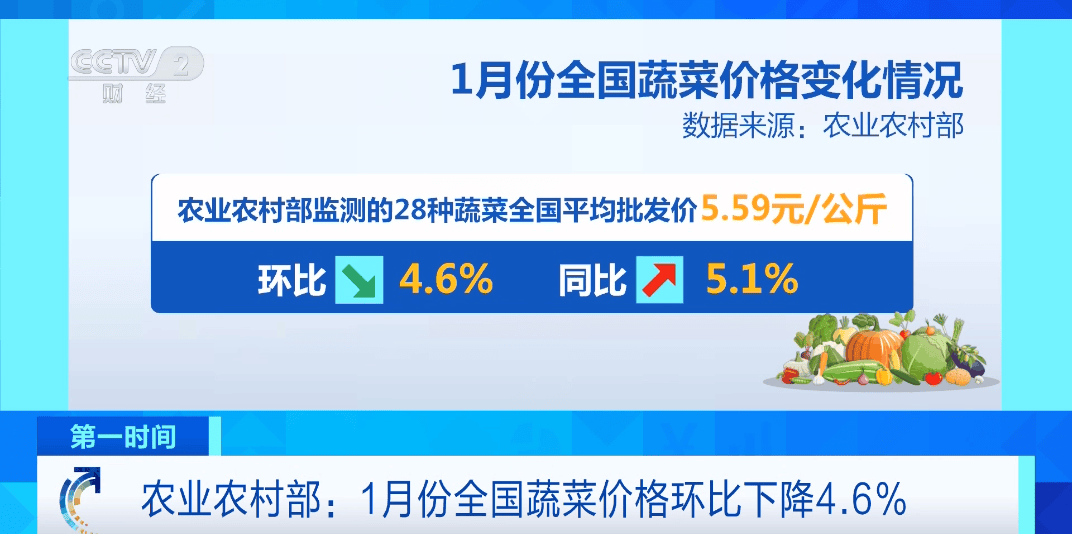 1月份,农业农村部监测的28种蔬菜全国平均批发价为每公斤5.59元,环比下降4.6%,同比上涨5.1%。分品种看,环比价格16种下降,12种上涨。其中,菜花、生菜和西葫芦价格降幅较大,超过20%。