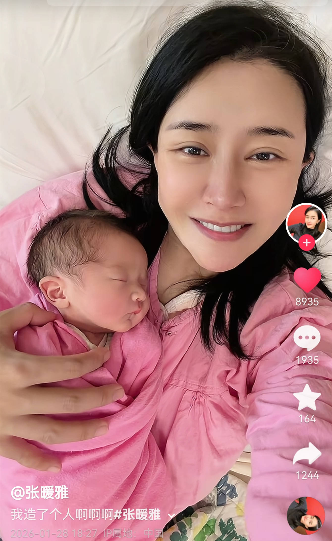 二、1月28日,她在社交平台发布了一段简短的视频。没有长篇大论,没有动情的背景音乐,画面也极为简单——粉色的包巾裹着刚出生的宝宝,黑发闪亮,熟睡的模样安静而美好。张暖雅躺在病床上,身穿粉色睡衣,脸色略显疲惫,但嘴角挂着轻松的笑容。配文也只有简短的一句:我造了个人啊。
