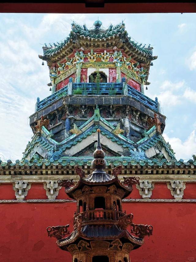 屋脊,是中式建筑的灵魂和脊梁,阳台宫的屋脊塑雕更是变幻万千。瑰丽绚烂的脊饰、出挑灵动的墙饰、凌空飞起的翼角……让人不禁赞叹连连。