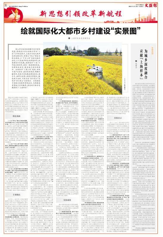 城乡融合发展是实现中国式农业农村现代化的必然要求,也是推进乡村全面振兴、实现共同富裕的重要保障。近年来,上海深刻践行习近平总书记关于城乡融合发展的重要论述,着力破解城乡发展不平衡和农村发展不充分的问题,扎实推进超大城市的乡村建设。一是强化顶层设计,统筹城乡布局。坚持高位谋划,将乡村振兴融入现代化国际大都市建设,以规划引领资源优化配置和政策协同,塑造“沪派江南”的乡村风貌,让乡村成为承载都市高品质生活的重要空间。二是激活乡村多元价值,培育城乡融合新动能。注重城市赋能作用,统筹乡村经济、生态、文化和社会价值,深化产业融合,打造特色鲜明的乡村品牌,推动乡村价值转化,让沉睡的乡村资源转化为服务城市、富裕农民的优质资产。三是健全市场机制与治理体系,构建城乡融合的长效机制。通过农村产权交易平台重组,发挥市场在资源要素配置中的决定性作用,发展壮大农村集体经济;同时,创新乡村运行模式,加强财政金融协同支持,提升乡村治理现代化水平,推动乡村从“建设”向“经营”转型。上海通过城乡融合发展,加快建设宜居宜业和美乡村,不仅使乡村成为服务城市高品质生活的重要载体,也在城乡治理双向赋能中积累了有益经验,为超大城市乡村振兴提供“上海样本”。