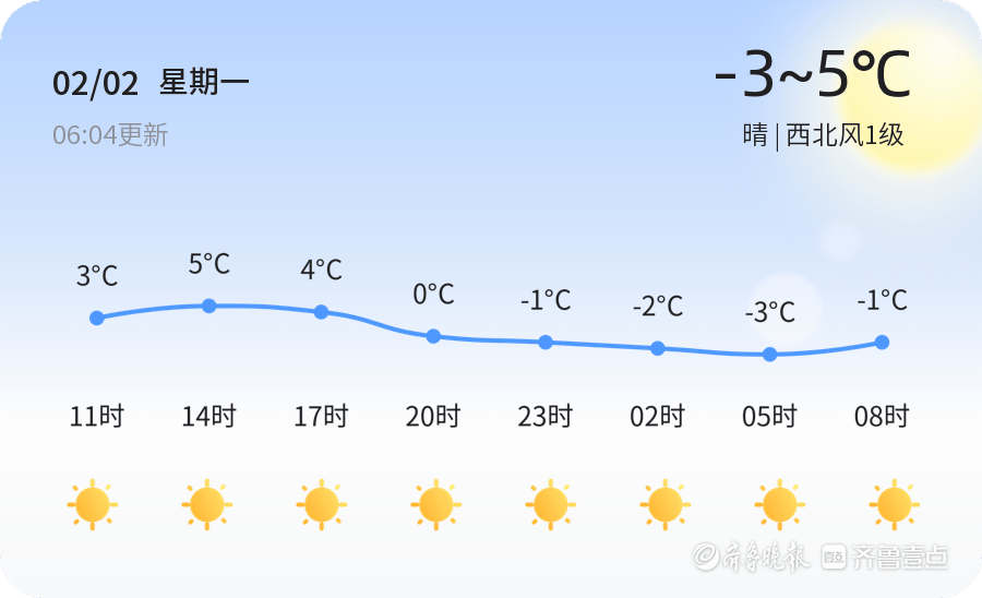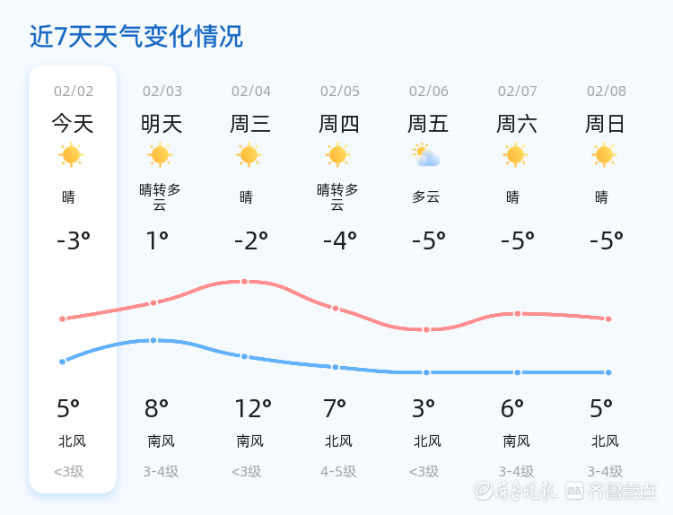 今天是2月2日,星期一,农历十二月十五。泰安市今天天气晴朗,气温为-3℃至5℃,西北风1级,空气湿度84%,PM2.5指数166。各区天气情况总体良好,市民出行需注意保暖,防范低温带来的不适。明天天气晴转多云,气温较今日有所上升,最低气温1℃,最高气温8℃,南风3-4级,风力较今日有所增强。未来三天,泰安市天气以晴到多云为主,气温逐步回升,最高气温可达12℃,最低气温-3℃。市民需注意气温变化,及时增减衣物,防范大风天气对出行的影响。温馨提示