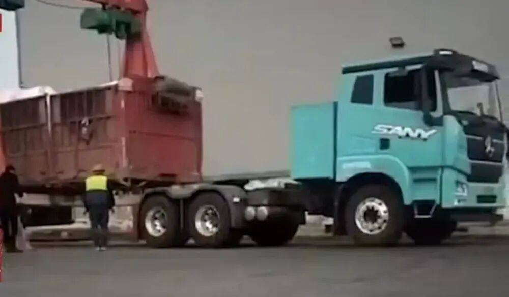 这辆红色豫H牌照的挂车被千斤顶支起后,王佳利和司机熟练地打开车头与挂车相连的牵引锁扣,解除刹车管道,将原本的柴油车头驶离,换上一旁等候的沪A牌照新能源电动车头,然后驶入河南江河纸业公司厂区卸煤。