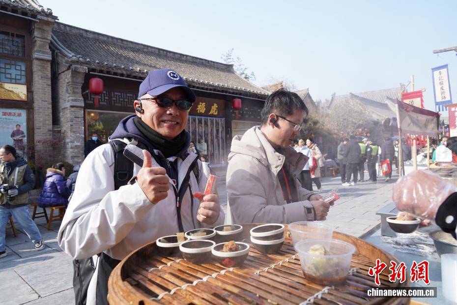 2月1日,参加2026年海峡两岸青年匹克球交流活动的台胞来到河南浚县。适逢新春佳节将至,大家沉浸式逛庙会、观社火、品美食、体验非遗制作,共同感受中原年味。图为台胞品尝浚县小吃。中新社记者 李超庆 摄