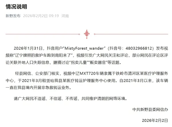 2026年1月31日,抖音用户“MistyForest_wander”(抖音号:48032966812)发布视频称“辽宁牌照的救护车跑到南阳来了”,视频引发广大网民关注和评论,部分网民在评论区评论关联外地人口失踪信息,臆猜讨论“拐卖儿童”“贩卖器官”等话题。