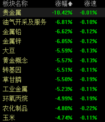 盘面上,黄金、基本金属现跌停潮,油气、煤炭、化工、钢铁跌幅靠前;农业、半导体、房地产跌幅明显。特高压概念股逆势上涨,白酒、培育钻石、AI应用题材活跃。