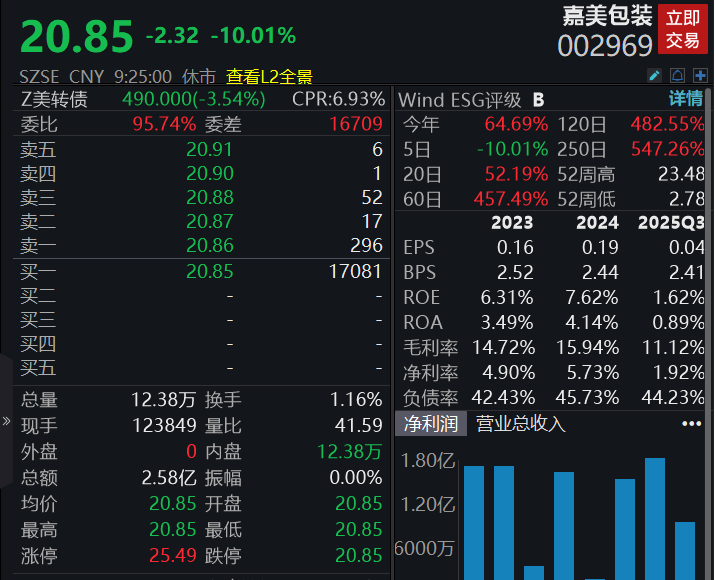 嘉美包装复牌跌停,此前涨幅达408.11%。