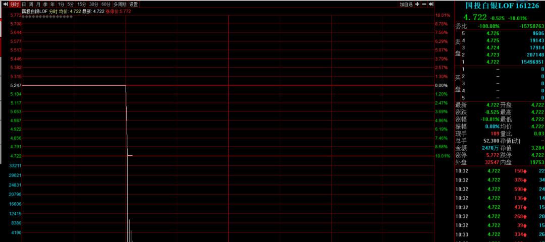 10:33 国投白银LOF复牌跌停,溢价率收窄至43.8%。深交所上周五表示,部分投资者在“国投白银LOF”等基金产品交易过程中存在影响基金正常交易秩序的异常交易行为,对相关投资者采取了暂停交易等自律监管措施。