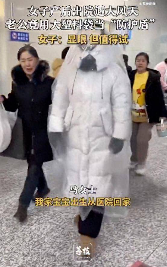 近日,辽宁省沈阳市一位女子在产后出院时遭遇大风天气,其丈夫竟以大塑料袋作为“防护盾”为她抵御风寒。