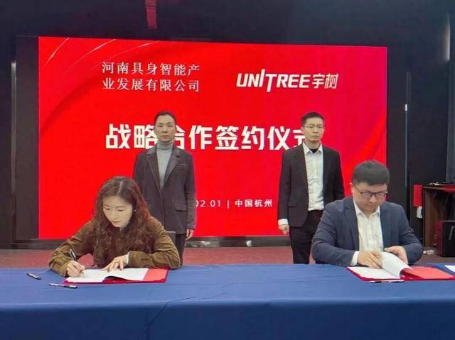 宇树科技创始人、CEO王兴兴,河南具身智能公司董事长靳娜等共同出席并见证签约。