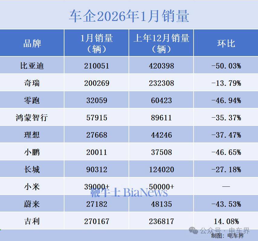 昨天开始,各车企相继公布1月销量数据,多数品牌销量环比出现不同程度下滑,电车界汇总部分数据如下: