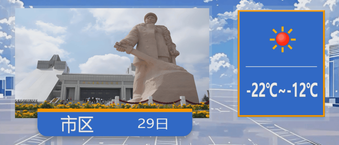 | 29 | 多云转晴 | 西北风3~4级转2~3级 | -22℃ | -14℃ |