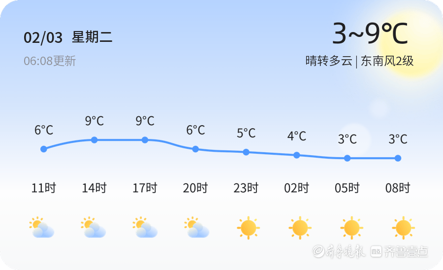 今天是2月3日,星期二,农历十二月十六。菏泽市今日天气以晴转多云为主,气温较为舒适,最低气温3℃,最高气温9℃,东南风2级。目前实时温度2.3℃,空气湿度75%,PM2.5指数152,属于中度污染,建议市民外出时做好防护措施。