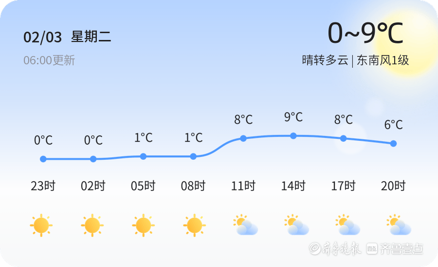 今天是2026年2月3日,农历十二月十六,济南迎来晴转多云的好天气。全市各区气温普遍在0℃到9℃之间,东南风1级,空气湿度为47%。天气状况良好,适合市民外出活动。