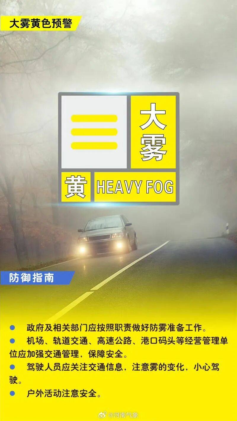 据河南省防灾减灾救灾委员会办公室、河南省应急管理厅消息,1月27日17时,省气象台发布大雾黄色预警:预计27日20时至28日12时,安阳中东部、濮阳、鹤壁、新乡、焦作东部、洛阳东北部、郑州、开封、商丘西部、平顶山、许昌、漯河、周口中西部、南阳东部和南部、驻马店、信阳部分县(市、区)将出现能见度低于500米的浓雾,其中新乡东部、开封南部、许昌东部、漯河东部、周口西部、南阳南部、驻马店东部、信阳北部部分县(市、区)有能见度低于200米的强浓雾,局部能见度低于50米。