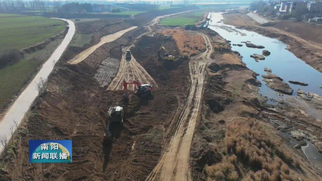 在卧龙区潦河镇潦河河道治理现场,大型工程车辆正在进行河道疏浚、岸坡防护、堤防加固等作业。