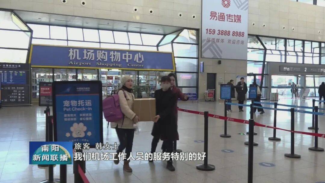 【南阳机场地面勤务部 宋新:春运期间,针对老弱病残孕等重点旅客,我们提供值机、行李托运、登机口的引导服务,同时,机场还提供超大、超重、超件行李的提前告知服务,免费为旅客发放“爱心随身袋”,确保大家安心舒心出行。】