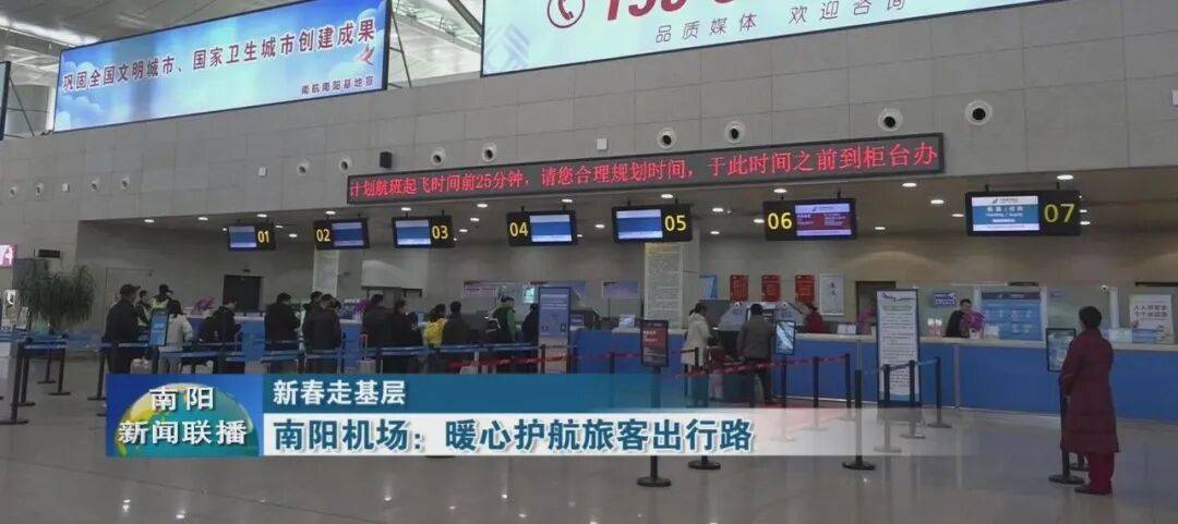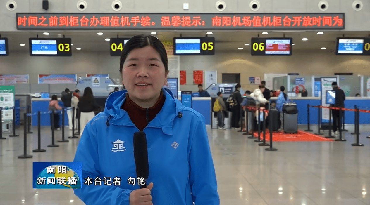 【南阳台记者 勾艳:今天是春运的第一天,我现在是在南阳姜营机场的候机大厅,在我身后,旅客们正排着整齐的队伍,井然有序地办理值机与行李托运手续,虽然客流量比平日有所增长,但整个乘机环境依然高效、顺畅。】