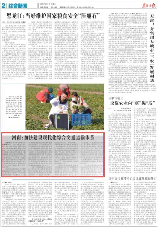 今日出版的《农民日报》刊发《河南:加快建设现代化综合交通运输体系》,报道了:近日,记者从河南省交通运输厅获悉,2026年河南省着力推进综合立体交通网建设,推进一体化融合、安全化提升、数智化升级、绿色化转型,实施内河航运提速、公路畅通提质、重卡充换电网络建设、普通干线公路穿城路段改造、多式联运提质攻坚、“人工智能+交通运输”、高速公路服务区品质提升、农村客货邮融合发展扩面提质、重大安全隐患动态清零、安全韧性提升等“十大行动”,确保实现“十五五”良好开局。