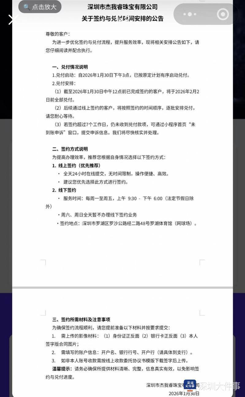 杰我睿在1月30日发布的公告显示,兑付将有序开始进行,客户可通过线上或线下两种方式签约,签约后将按照顺序兑付。