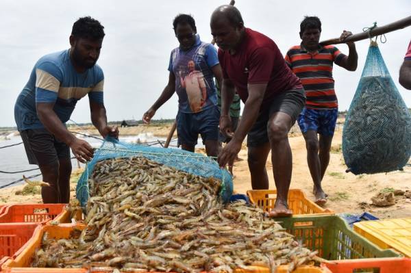 2025年8月28日,印度安得拉邦内洛尔区,工人在虾场搬运虾袋装车。据印度海鲜出口协会(SEAI)称,美国自8月27日起提高关税,威胁到印度约20亿美元的虾类出口,给该国虾业带来重大挑战。IC Photo