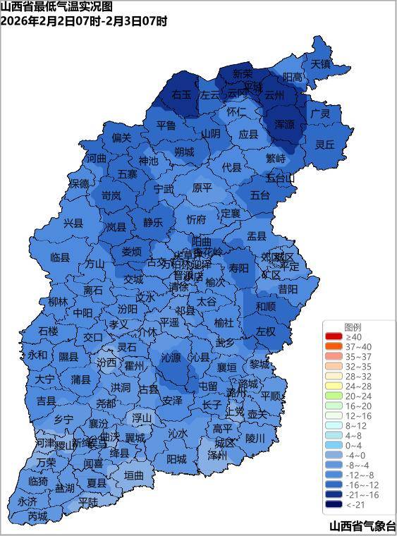 2月2日07时至3日07时,全省各地最低气温介于-20.7℃(新荣区)~-1.8℃(垣曲)之间。其中,新荣区在-20℃以下,繁峙、神池、古交、中阳、保德、大宁、代县、宁武、隰县、兴县、定襄、襄垣、蒲县、小店区、阳高、方山、灵丘、山阴、岚县、河曲、左云、沁源、天镇、和顺、阳曲、寿阳、娄烦、偏关、平鲁区、左权、静乐、广灵、朔城区、五寨、五台、岢岚、平城区、云冈区、浑源、云州区、右玉共41个县(市、区)在-20~-10℃之间。